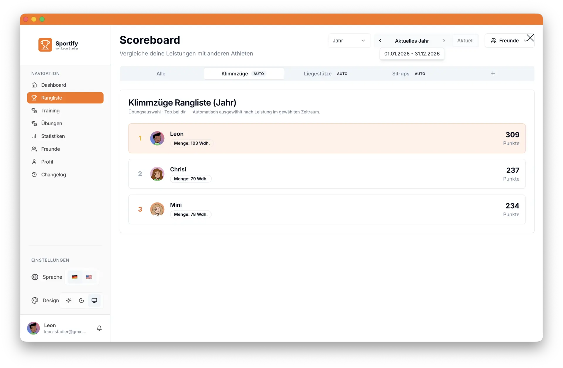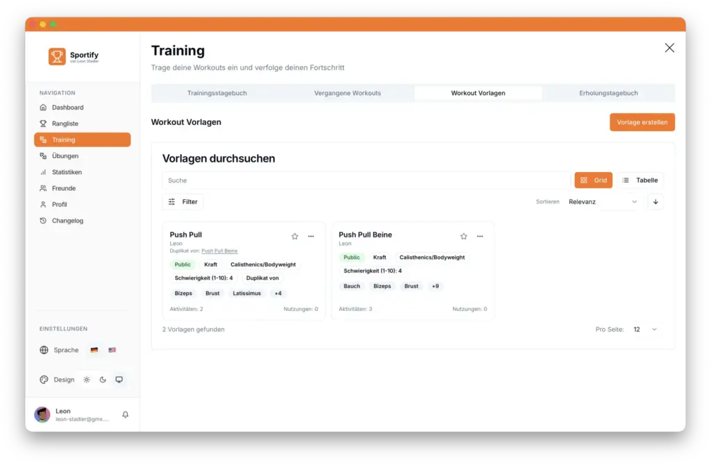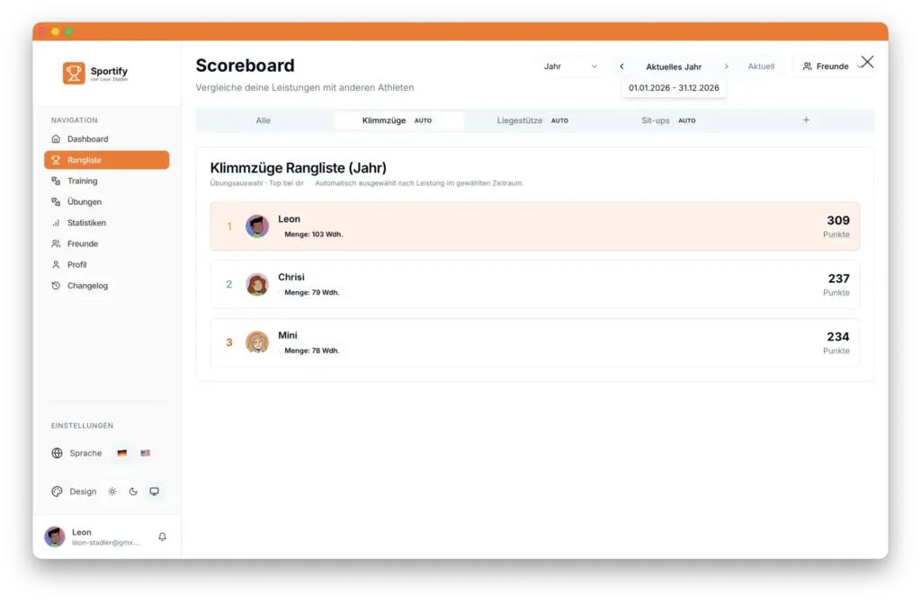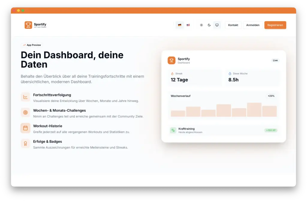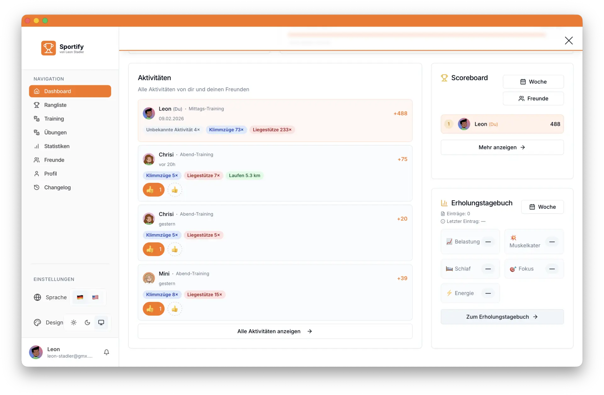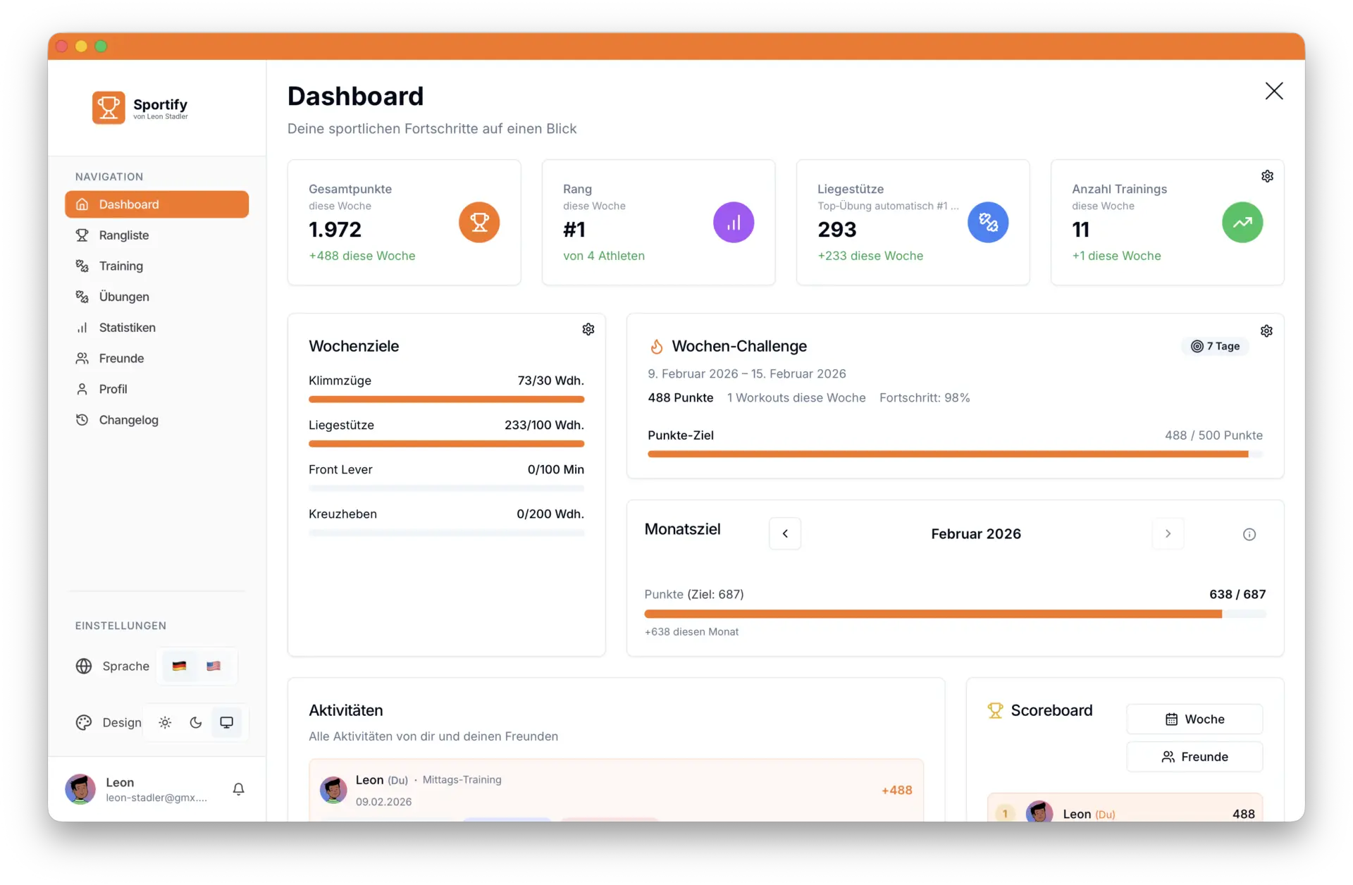 Aus diesen Bedürfnissen entstand eine klare Produktvision: Sportify soll sich anfühlen wie ein guter Trainingspartner — zuverlässig, kompetent, aber nie aufdringlich. Von Anfang an standen bestimmte Features fest: Zweisprachigkeit, weil unsere Gruppe deutsch- und englischsprachige Mitglieder hat. PWA mit Offline-Support als technische Notwendigkeit. Soziale Features als Kern der Idee. Wöchentliche Ziele, Challenges und ein Scoreboard für langfristige Motivation.