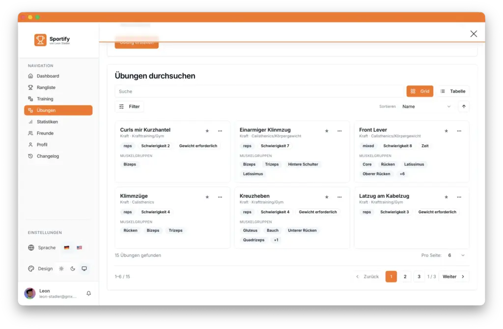Die mit Abstand größte Veränderung, an der ich etwa zwei Monate gearbeitet habe, war der Umbau des Übungssystems. In der ersten Version waren alle Übungen hart codiert — eine feste Liste, und das war es. Sobald mehr Leute die App nutzten, wurde klar, dass jeder andere Übungen macht. Also entwickelte ich ein komplett dynamisches System: Jede Übung ist jetzt ein Datensatz mit Kategorie, Bewegungsmuster, Muskelgruppen, Equipment, Messtyp und Schwierigkeitsgrad. Nutzer können eigene Übungen anlegen, Administratoren die Datenbank kuratieren. Das berührte die gesamte Architektur — Datenbank, API, Scoring, UI, Statistiken — und alle bestehenden Daten mussten migriert werden, ohne dass etwas verloren geht. Rückblickend war das der Moment, in dem aus einer kleinen Trainings-App ein ernsthaftes Produkt wurde.